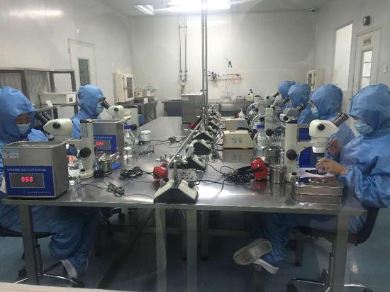 技術(shù)人員在密閉實(shí)驗(yàn)室內(nèi)對(duì)眼科產(chǎn)品進(jìn)行超聲波清洗。聶晨靜 攝
