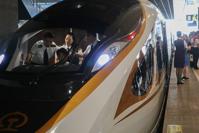 6月26日,在上海虹橋火車站,工作人員在“復(fù)興號”G124次列車駕駛艙內(nèi)進行發(fā)車前的準備。“復(fù)興號”是由中國鐵路總公司牽頭組織研制、具有完全自主知識產(chǎn)權(quán)、達到世界先進水平的中國標準動車組。