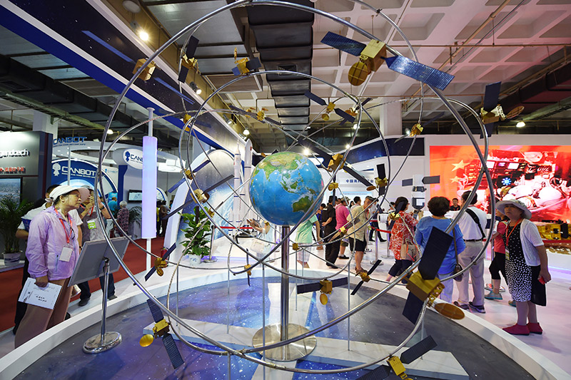 6月9日,參觀者在第二十屆中國北京國際科技產(chǎn)業(yè)博覽會上參觀展出的北斗衛(wèi)星導航系統(tǒng)模型。