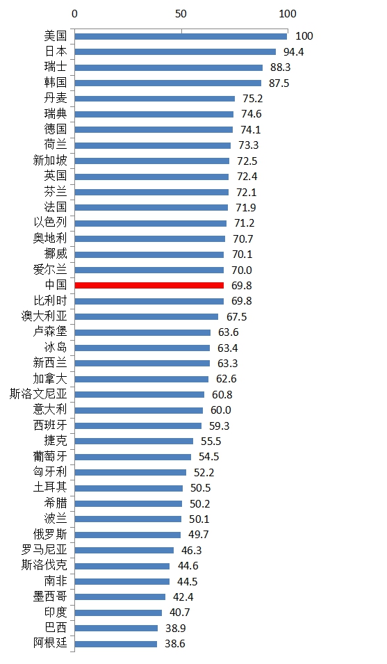 “金磚五國(guó)”除中國(guó)外,排名均在30名之后。俄羅斯列第33位,處于第三集團(tuán)中的領(lǐng)先位置;南非、印度和巴西在40國(guó)中仍處于靠后的位置,分列第36、第38和第39位。