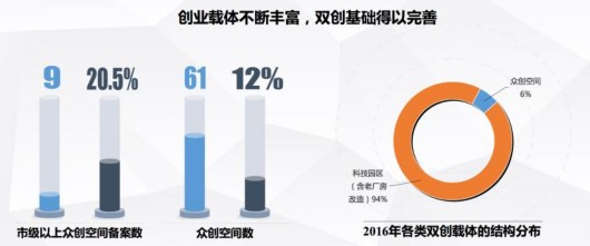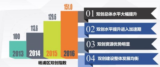 經(jīng)過指標測算顯示,以2013年作為基期,楊浦區(qū)“雙創(chuàng)指數(shù)”從2013年的100(基期賦值)上升至2016年的151.0,增幅高達51%。其中,2016年較上年增長16.5%,成為歷年增速增長高的一年,雙創(chuàng)發(fā)展增速逐年提升。此外,各分項指數(shù)也均有提高,其中以雙創(chuàng)影響指數(shù)增長為強勁,從2013年的100增長到了2016年的153.1,較上年增長22.8%。“雙創(chuàng)影響力和成果的增幅比要素和環(huán)境明顯,這也表明,創(chuàng)新的要素和環(huán)境需要長時間的投入來改善,創(chuàng)新創(chuàng)業(yè)的發(fā)展需要積極進取,還需要厚積薄發(fā)、沉得住氣。”楊浦區(qū)發(fā)改委張?zhí)鞜槺硎。報告顯示,近年來楊浦區(qū)各類雙創(chuàng)載體面積(含老廠房改造)持續(xù)擴大,截至2016年,楊浦區(qū)各類雙創(chuàng)載體面積已達到162.3萬平方米,其中,科技園區(qū)(含老廠房改造)面積占據(jù)各類雙創(chuàng)載體總面積的94.3%。同時,如長陽創(chuàng)谷等園區(qū)的品牌效應逐漸形成和擴散,服務能級不斷提升。與此同時,市級以上眾創(chuàng)空間備案數(shù)占上海比例呈逐年上升態(tài)勢。至2016年,楊浦已初步建成各類“眾創(chuàng)空間”61家,約占上海市總量的12%。其中,國家級眾創(chuàng)空間授牌為9家,占全市的20.5%;市級眾創(chuàng)空間授牌為16家,占全市的14%。