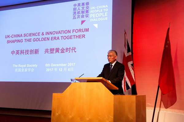 2017年12月6日,中國科學(xué)技術(shù)部與英國商業(yè)、能源和產(chǎn)業(yè)戰(zhàn)略部在英國皇家學(xué)會共同舉辦“中英科技創(chuàng)新合作:共塑黃金時代”論壇,該活動是中英高級別人文交流機制第五次會議的重要活動之一。國務(wù)院副總理劉延?xùn)|、科技部黨組書記、副部長王志剛與英國約克公爵安德魯王子、英國大學(xué)、科學(xué)、研究與創(chuàng)新國務(wù)大臣喬·約翰遜(Jo Johnson)等出席論壇致辭并參觀了中英科技創(chuàng)新成果展。