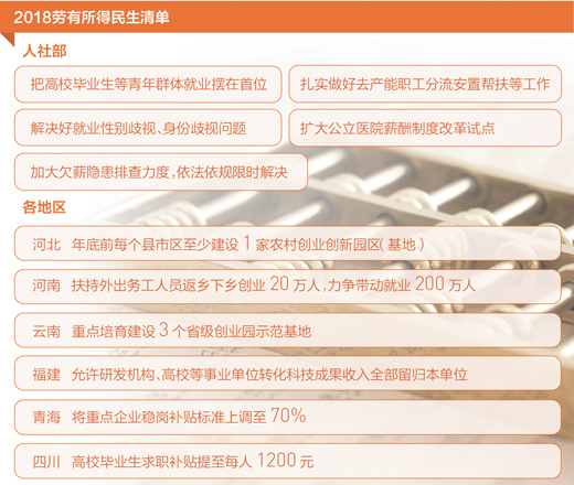 2018年,勞有所得有兜底。青海今年起將重點企業(yè)穩(wěn)崗補貼標準上調至70%。四川高校畢業(yè)生求職補貼提至每人1200元。遼寧全省執(zhí)行新調整后的低工資標準。上海制定欠薪單位“黑名單”……
